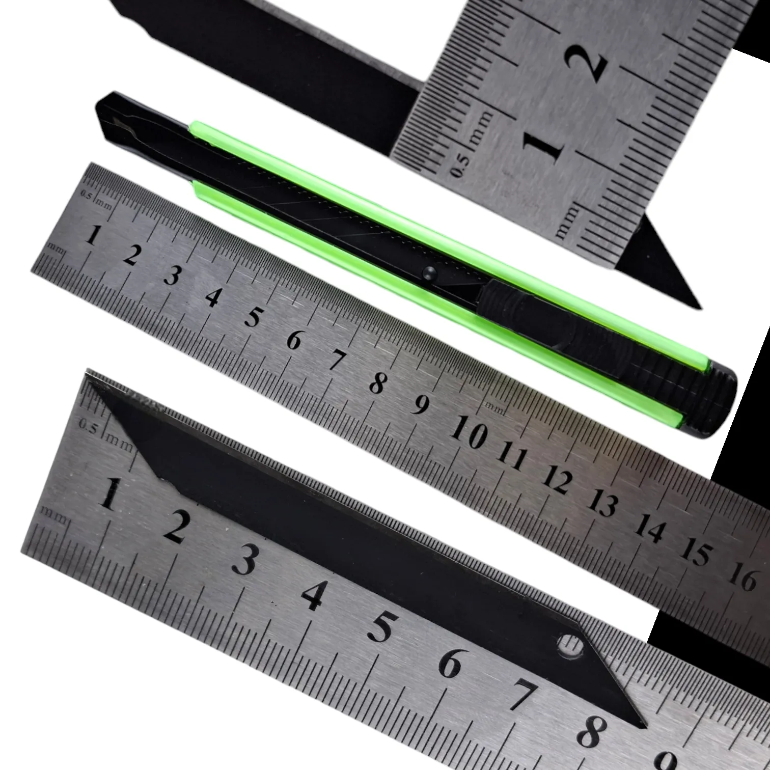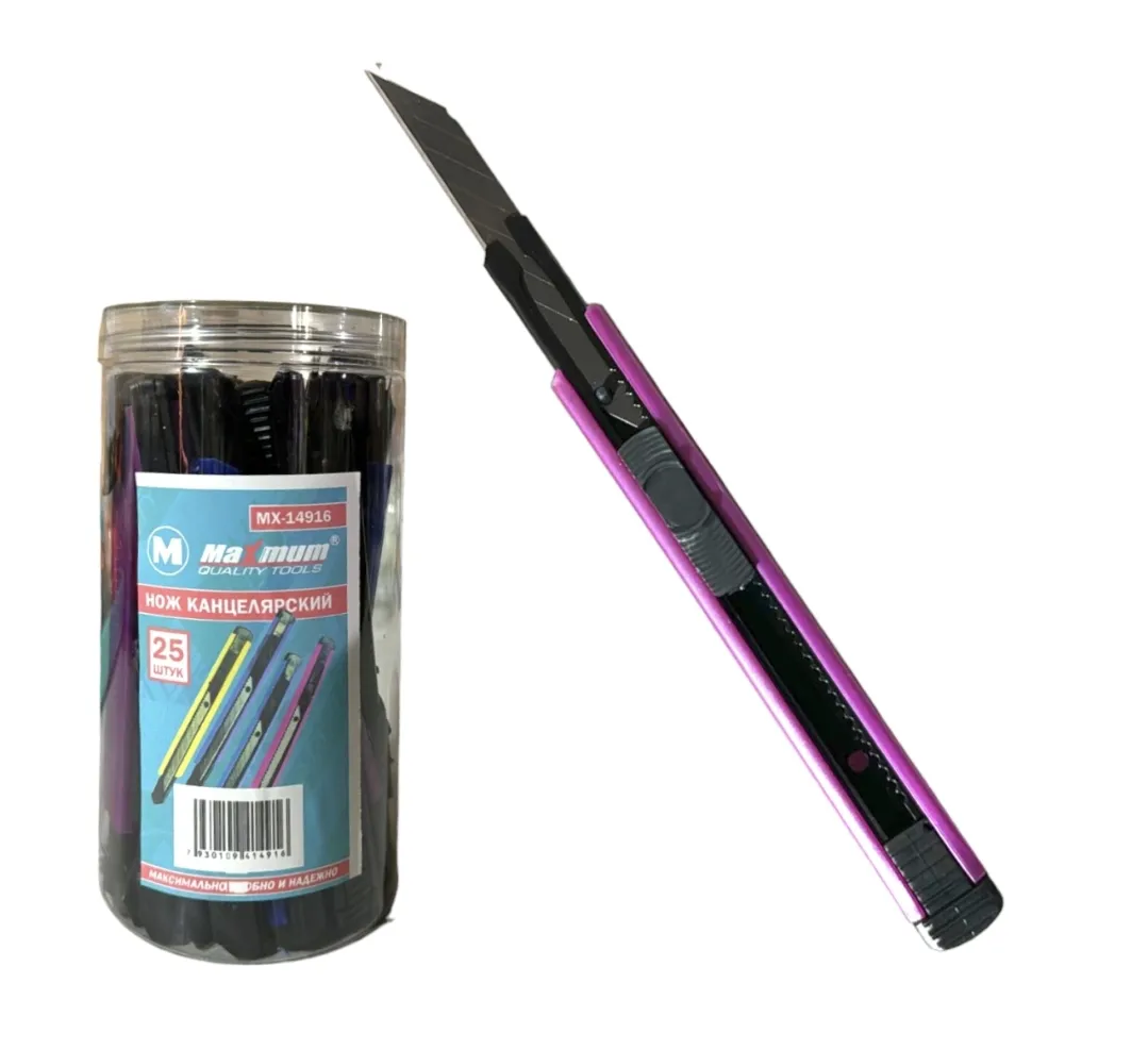 Нож канцелярский с фиксатором и металлической направляющей оборудован сегментированным лезвием 11× 85 мм и поставляется в различных цветах. Канцелярские ножи длиной 145 мм поставляются по 25 шт. в пластиковом боксе от "Maximum Quality Tools" и предназначены для резки бумаги, картона, ткани и пластика. Ребристый пластиковый корпус надежно лежит в руке и не скользит. Отламывающиеся сегментированные стальные лезвия не боятся коррозии и имеют качественную заводскую заточку. Система фиксации лезвия push-lock и насадка для безопасного отделения сегмента лезвия делают работу безопасной.