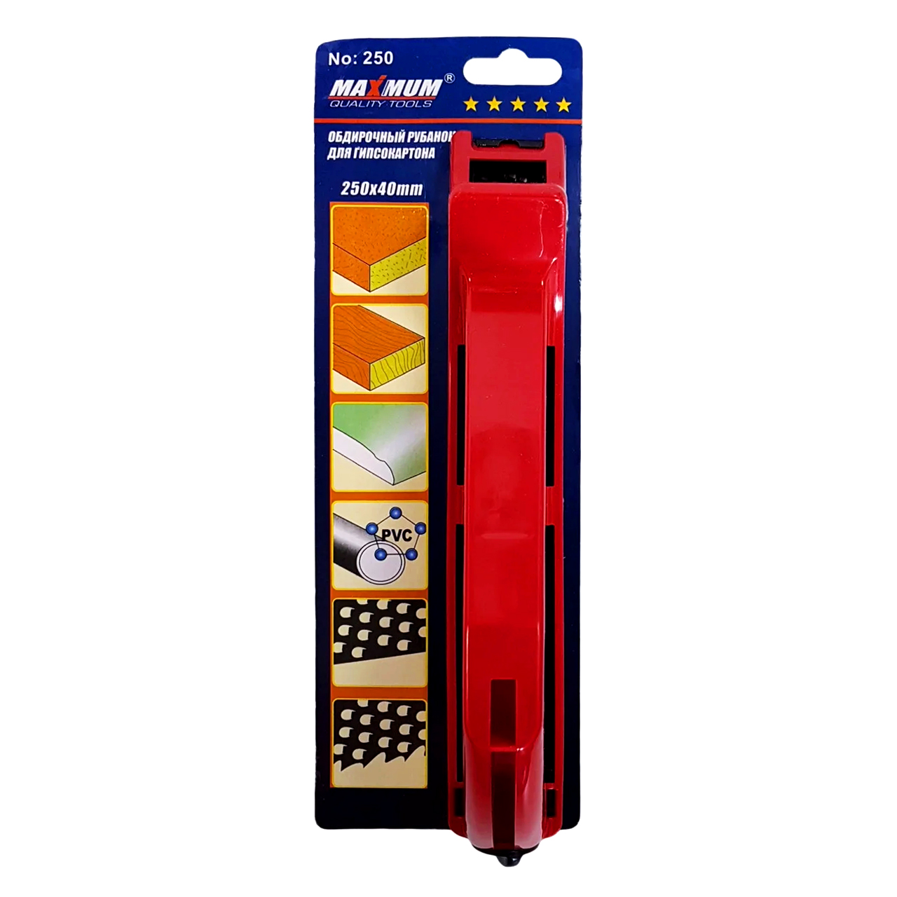 Рубанок по гипсокартону 250х40 мм от Maximum предназначен для обдирочных работ мягких материалов: ГЛК, ДСП, ДВП, древесины, гипсокартона, пластмассы.
