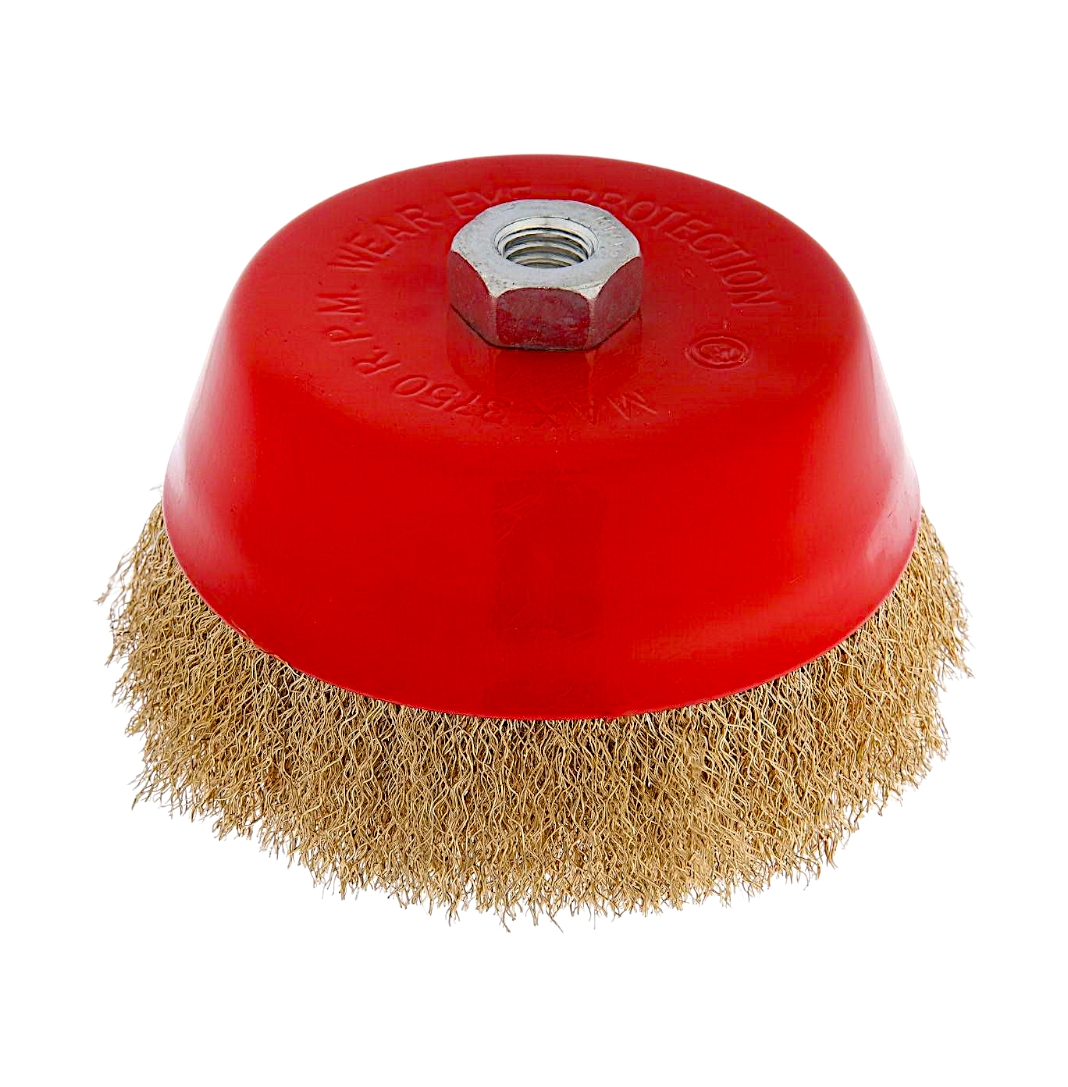 Щетка латунированная для УШМ предназначена для зачистки изделий, удаления ржавчины и грязи с металлических поверхностей. Гайка М14 предназначена для шлифовальных и отрезных машин. Стальная латунированная волнистая проволока рассчитана на максимальное количество оборотов до 3750 RPM, не подвержена коррозии и окислению.